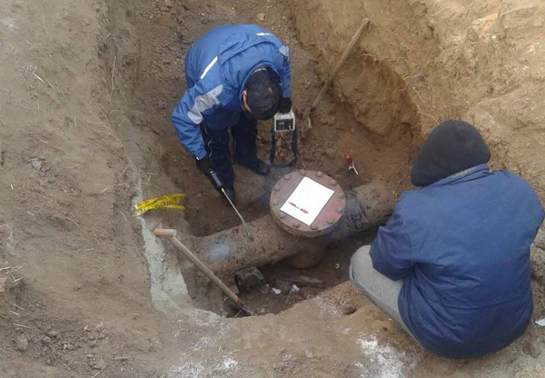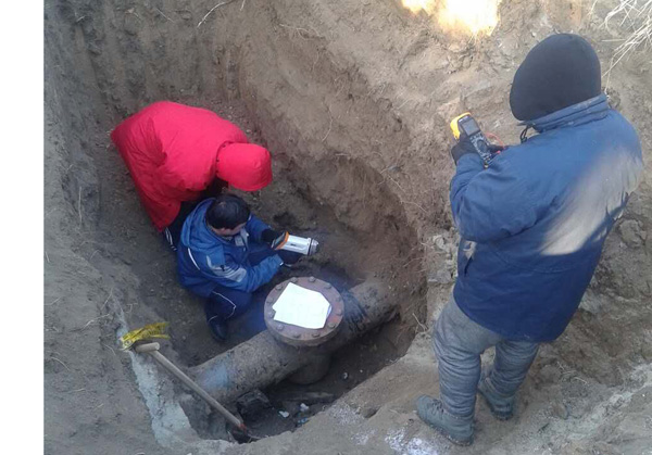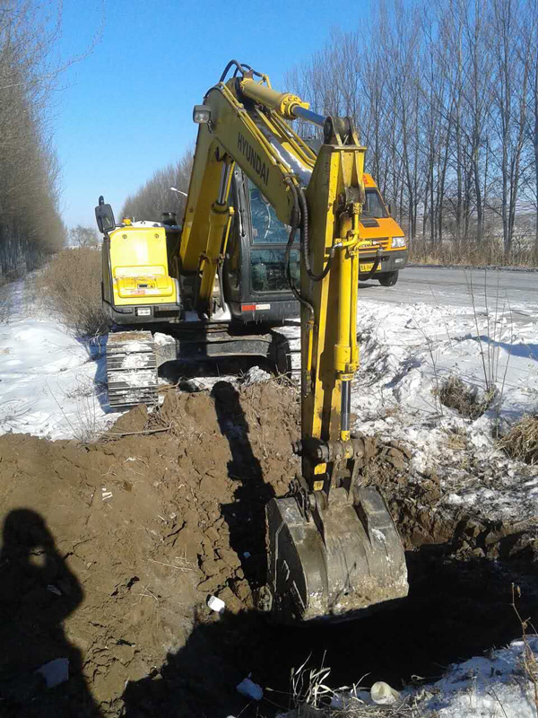 为节约施工的征地费用,抢修大队选择在冬季挖土施工,动用了一台小型挖沟机,两台油镐,抢险车一台。早8点出发,到达施工地点后,用破碎镐打开面层,人工清土,挖到第二层,冻层已达1.2米,为不破坏管道防腐层,见到暖土,便采用人工开挖。