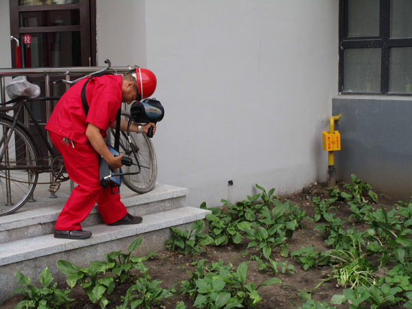 9时25分,应急小分队人员全部到位,领取工具、记录等应急物资后,应急指挥组长下令应急处置开始,各组按照职责分工迅速开展应急工作。警戒组按照漏气范围立即设置警戒区域,并疏散附近人员;阀井组按照进入受限空间作业许可要求将该小区的控制阀井关闭;停气组在指挥组长下达指令后依次关闭调压柜、26个单元引入,并张贴停气通知单;室外监测组对小区“三沟”、地下停车库等进行室外监测;室内监测组对单元内、居民家中的烟道、地漏等进行监测,发现异常及时疏散居民。9时40分抢险大队进入现场,修复调压柜漏气部位。10时10分,各组向指挥组汇报已恢复送气,并张贴恢复供气通知单。指挥组长下令此次应急结束,各小组集合。