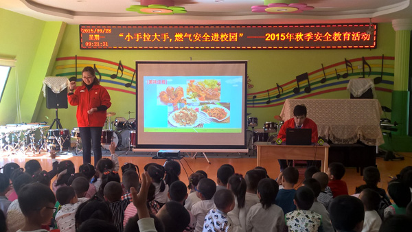 临下课时,讲解员和全体师生共同朗读燃气公司的报警电话,同时请50名小朋友作为燃气公司的安全小卫士,并发放了安全小卫士粘贴,让燃气安全知识通过孩子走进百姓家中。